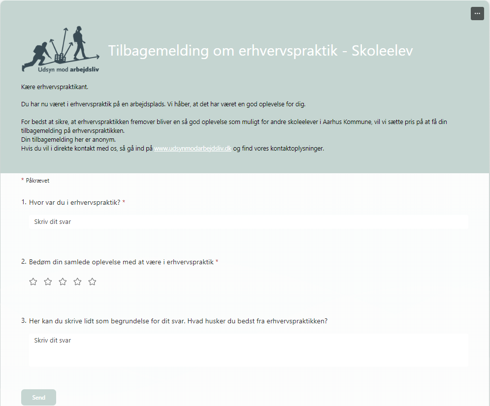 Vi vil meget gerne høre lidt om, hvordan det har været for dig at være i erhvervspraktik. Giv os meget gerne din tilbagemelding via spørgeskemaet her.