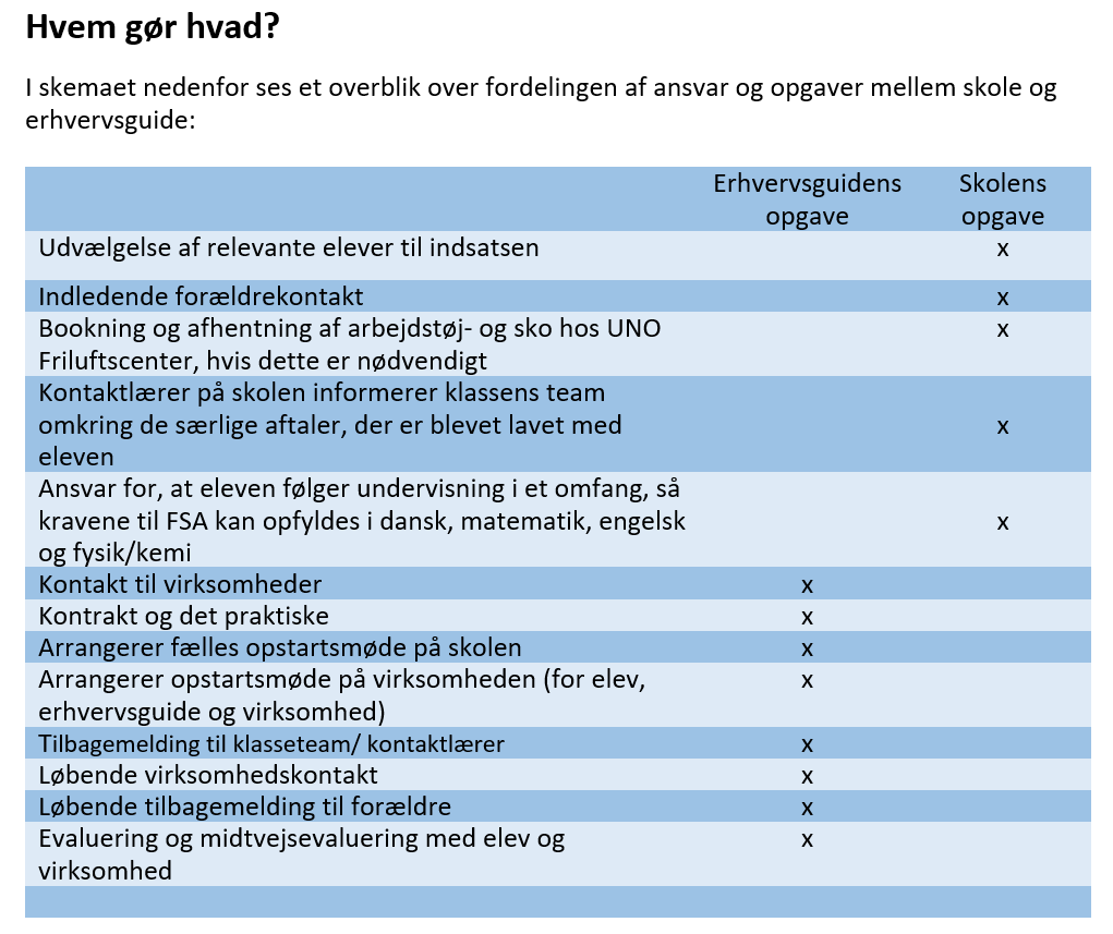 - Opstartsmøde på virksomheden mellem den unge, erhvervsguide og en repræsentant fra virksomheden – her aftales de praktiske ting omkring praktikken.